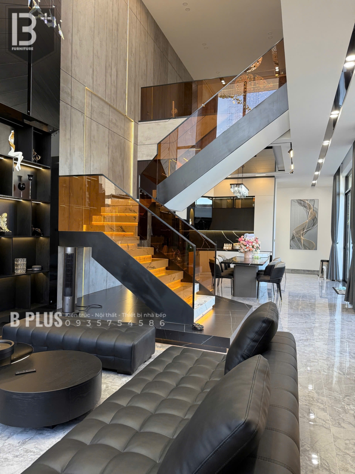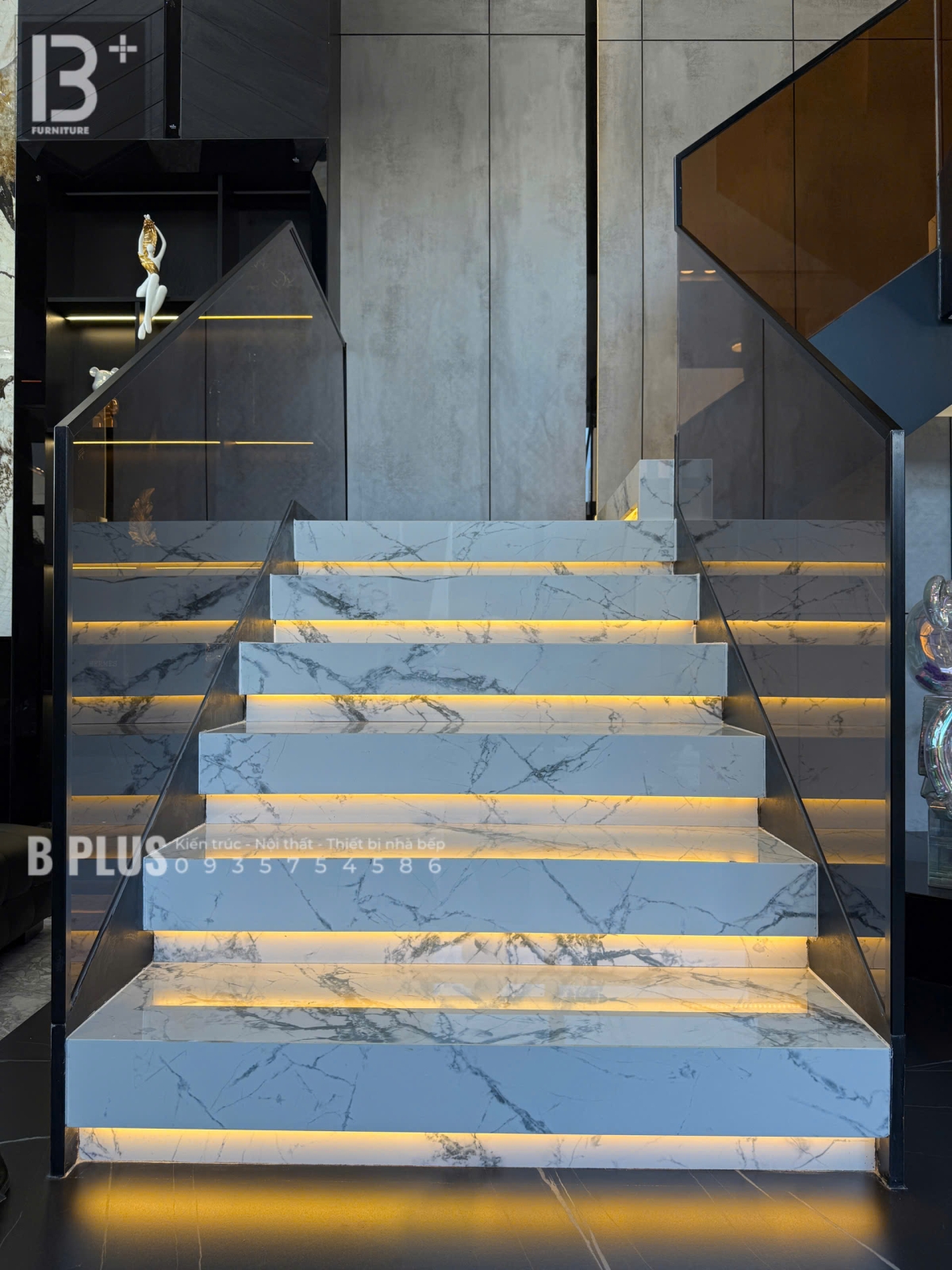 Cầu thang kính với hệ đèn led âm sàn tạo hiệu ứng sang trọng và liên kết không gian, trong khi mảng tường đá tự nhiên phía sau TV trở thành “trái tim” của ngôi nhà – vừa nghệ thuật vừa mạnh mẽ.