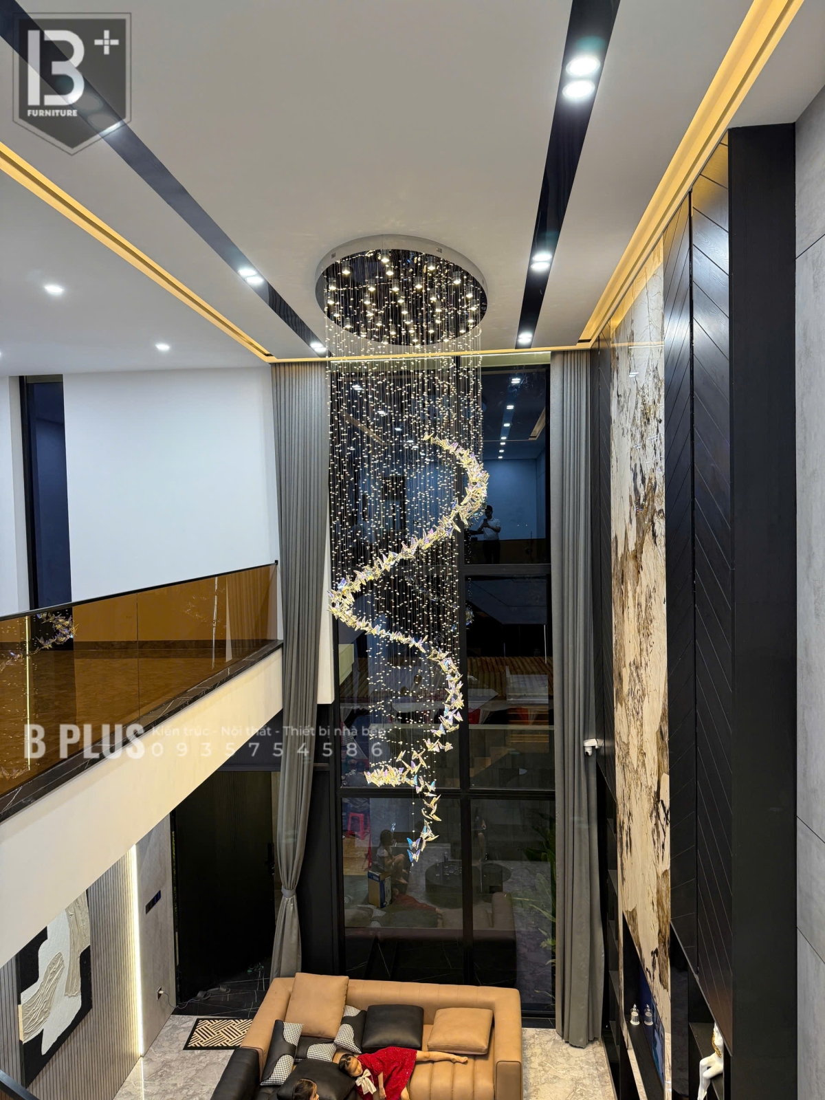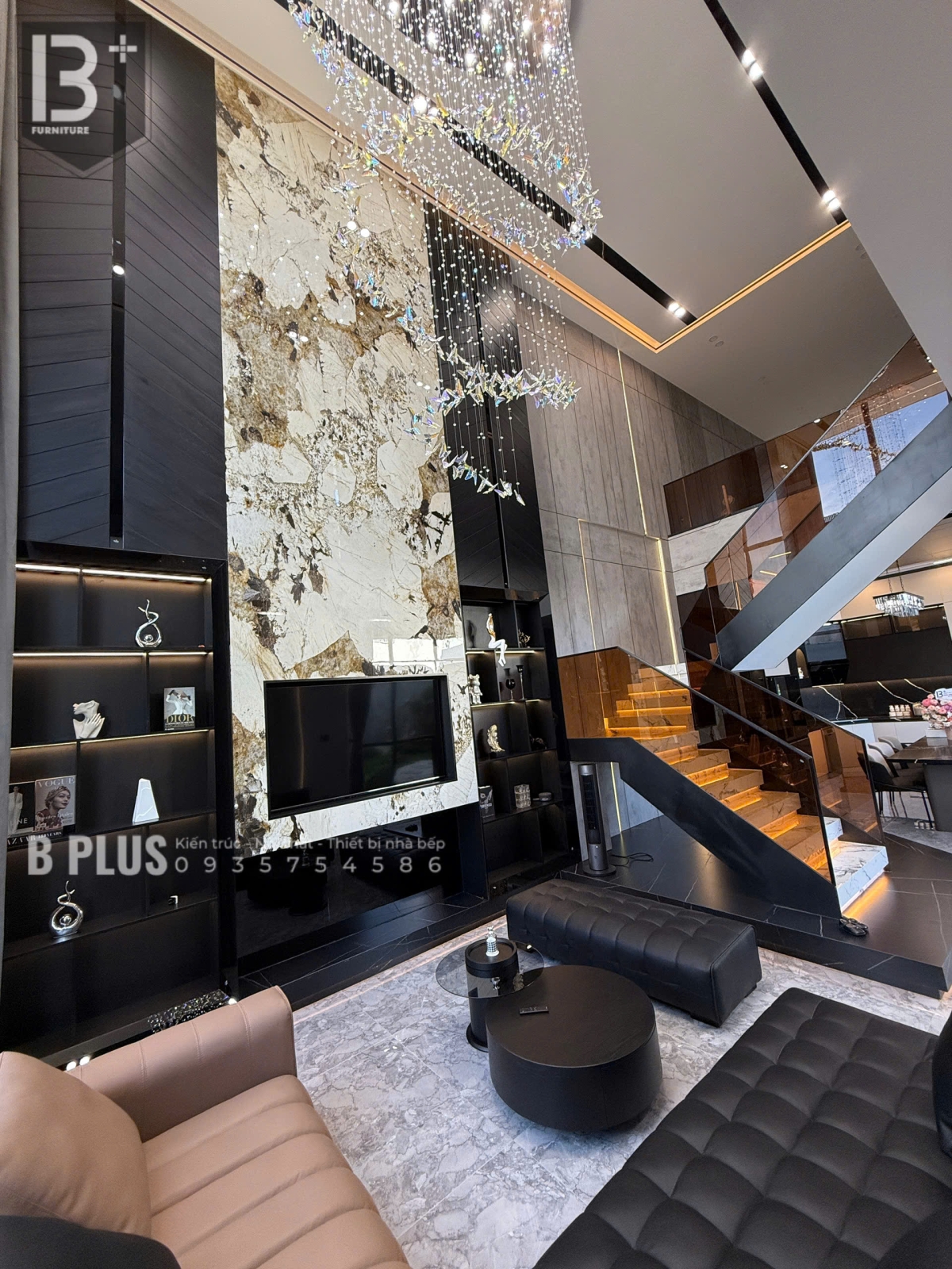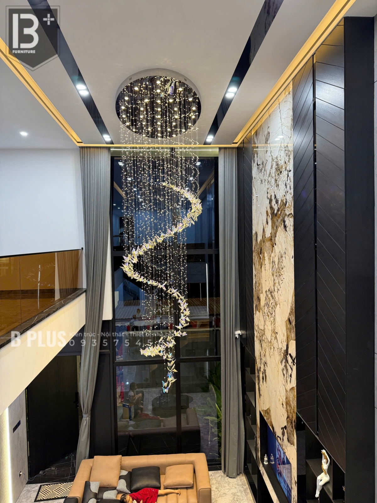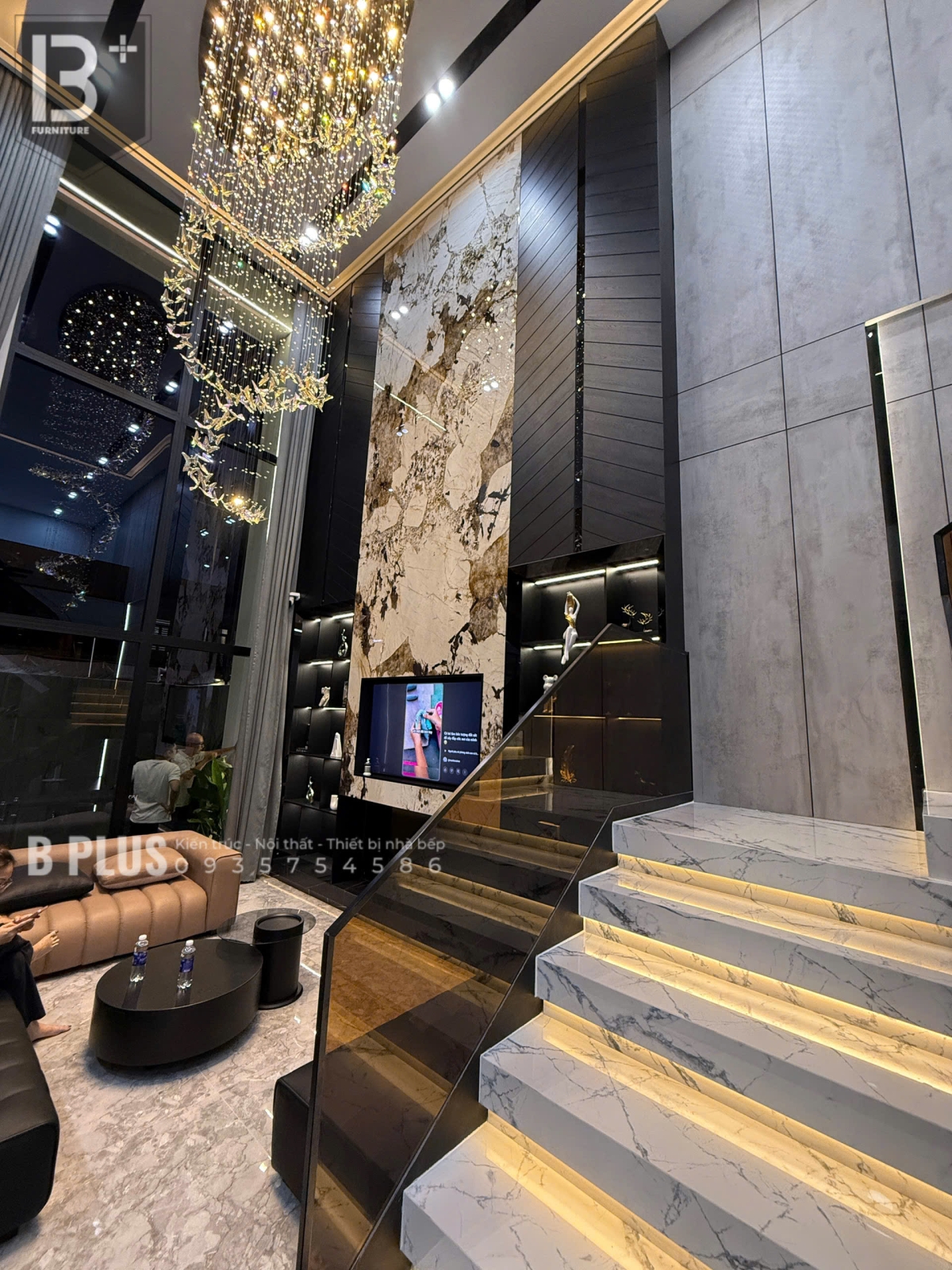 Ngay từ khu vực phòng khách, tổng thể ngôi nhà gây ấn tượng mạnh với thiết kế trần cao, đèn thả pha lê ánh vàng tạo điểm nhấn nổi bật, kết hợp cùng mảng tường ốp đá vân tự nhiên mang vẻ đẹp đẳng cấp và bền vững theo thời gian.
