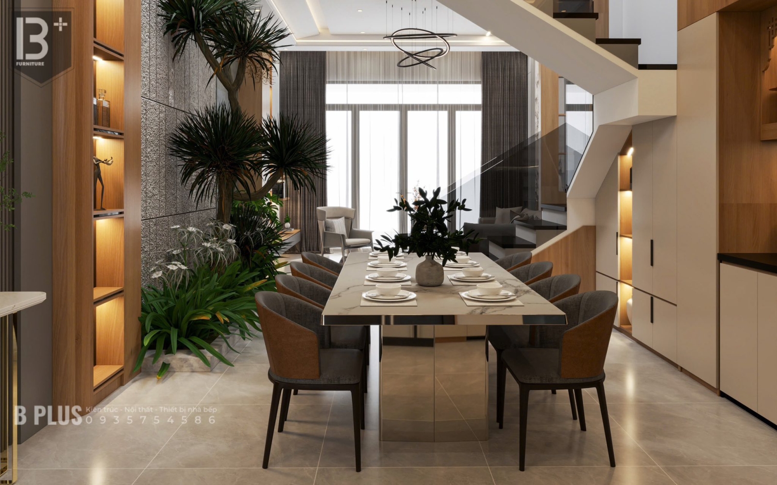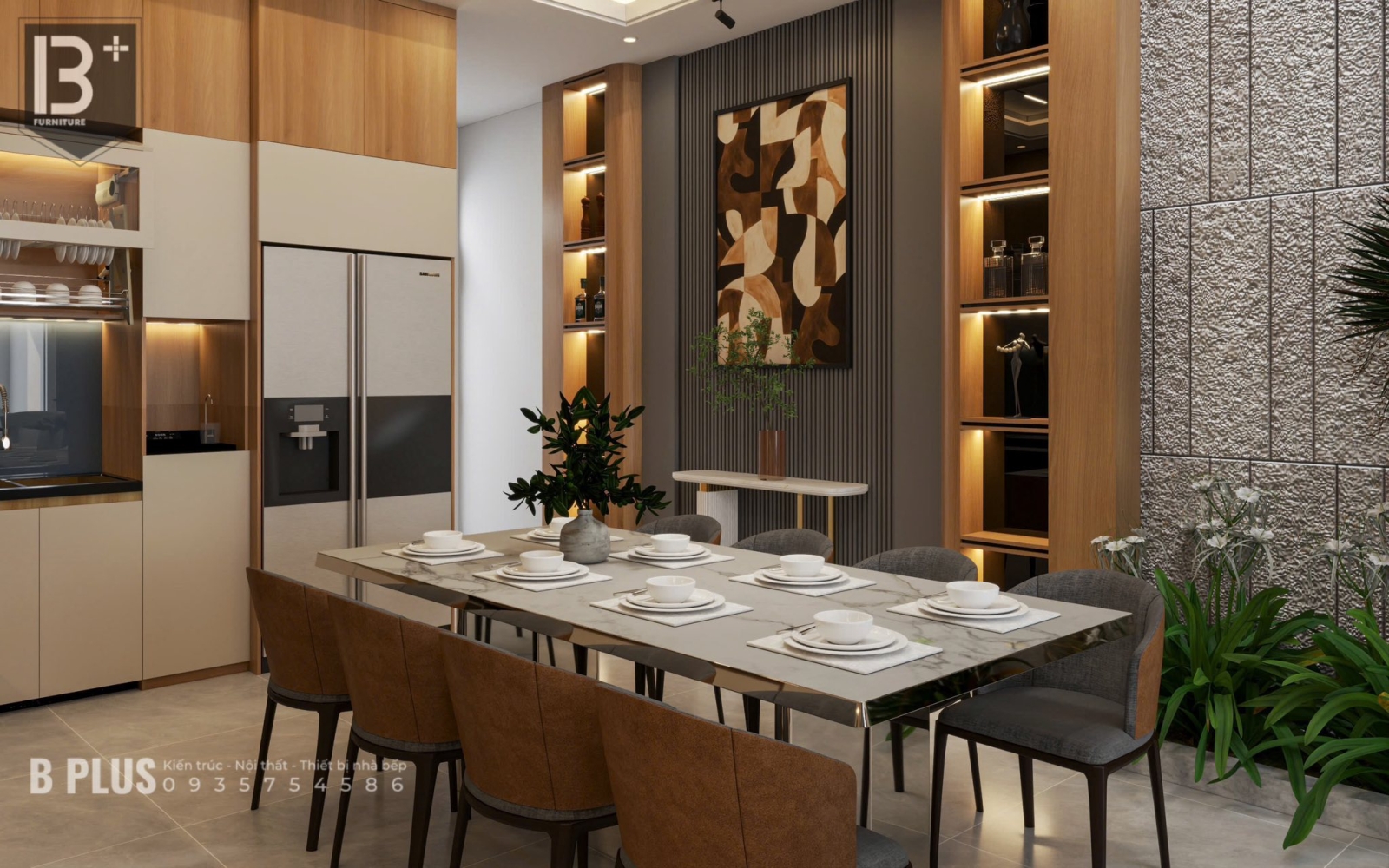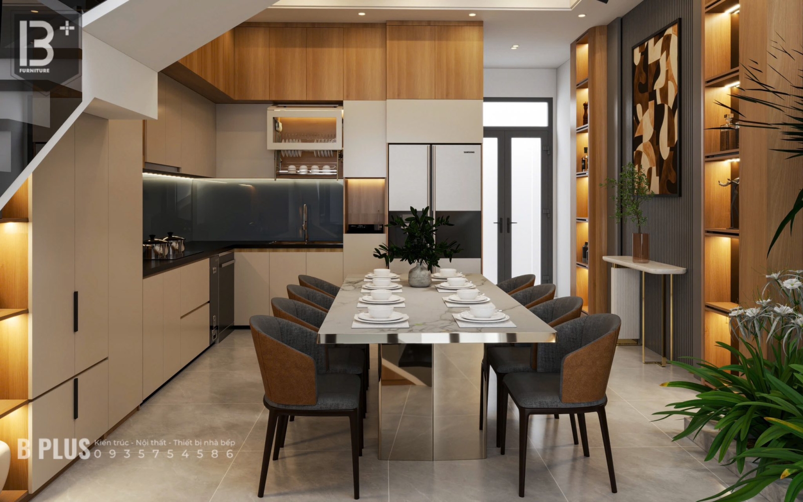 Phòng bếp & ăn: Trái tim của ngôi nhà với hệ tủ bếp kịch trần tối ưu lưu trữ, bộ bàn ăn mặt đá rộng rãi – nơi giữ lửa cho những bữa cơm gia đình.