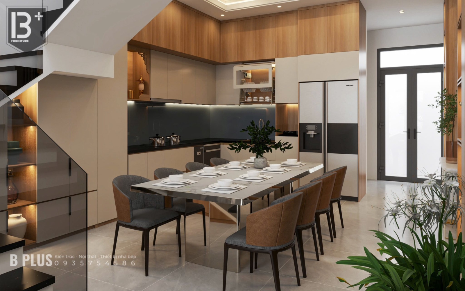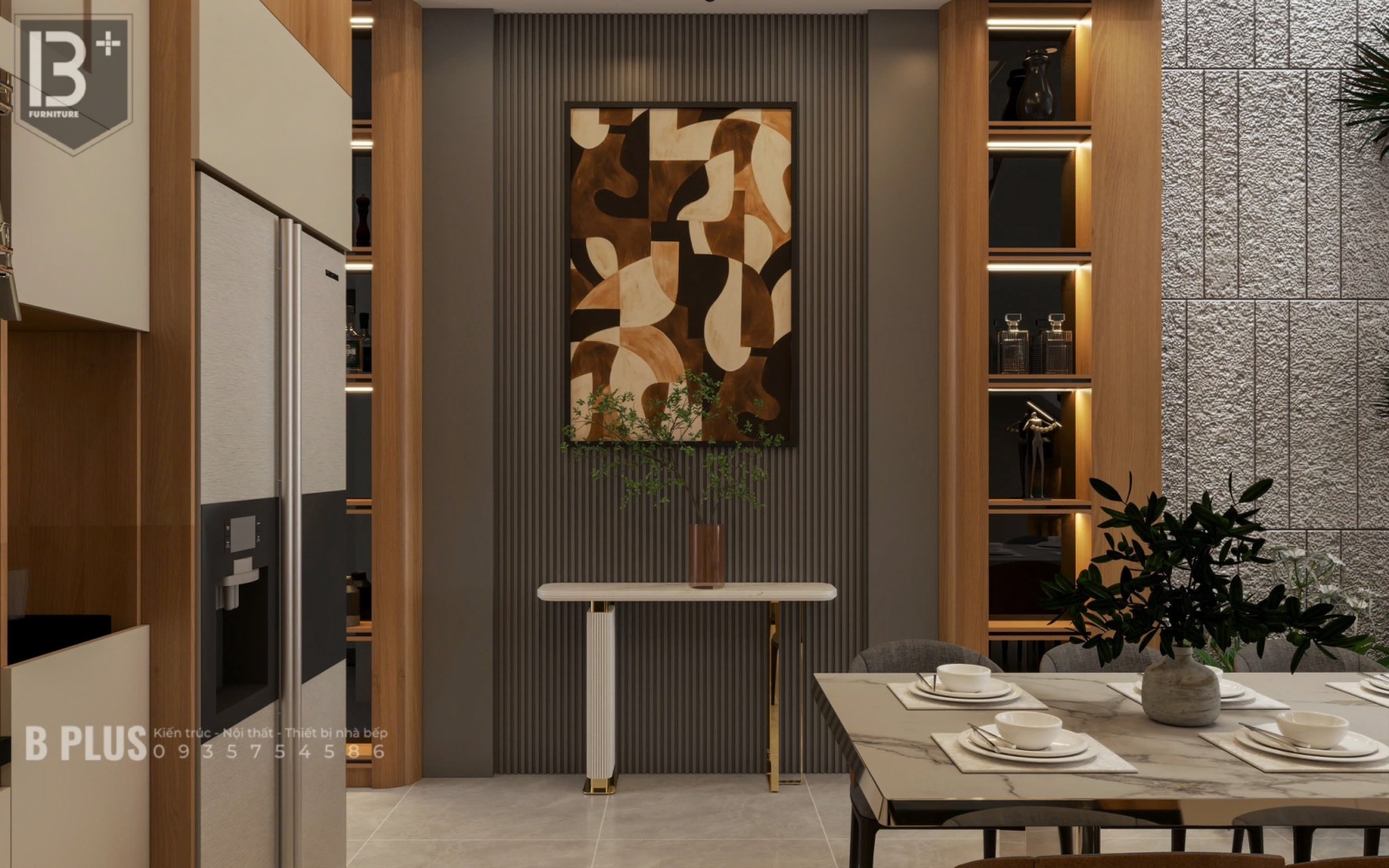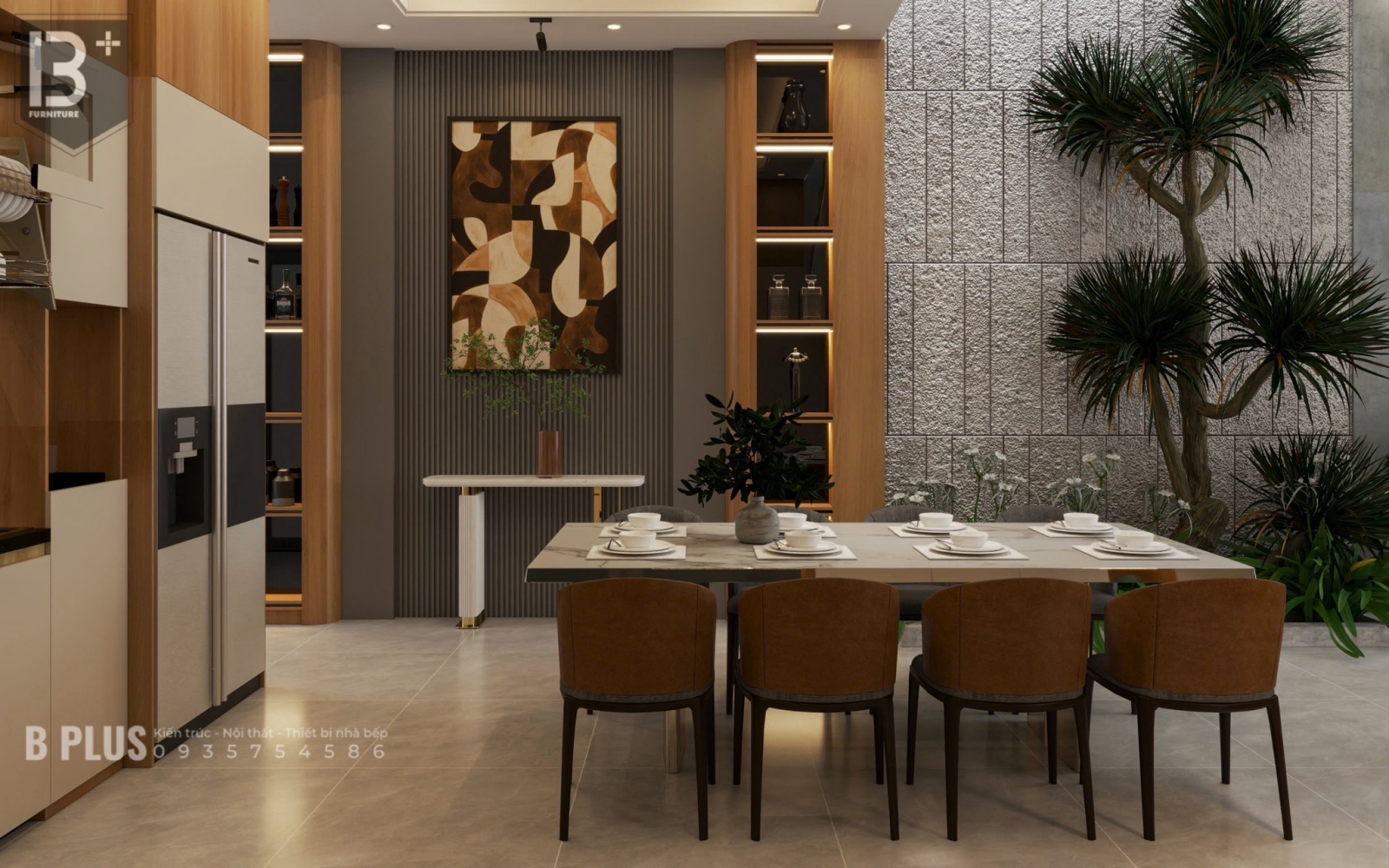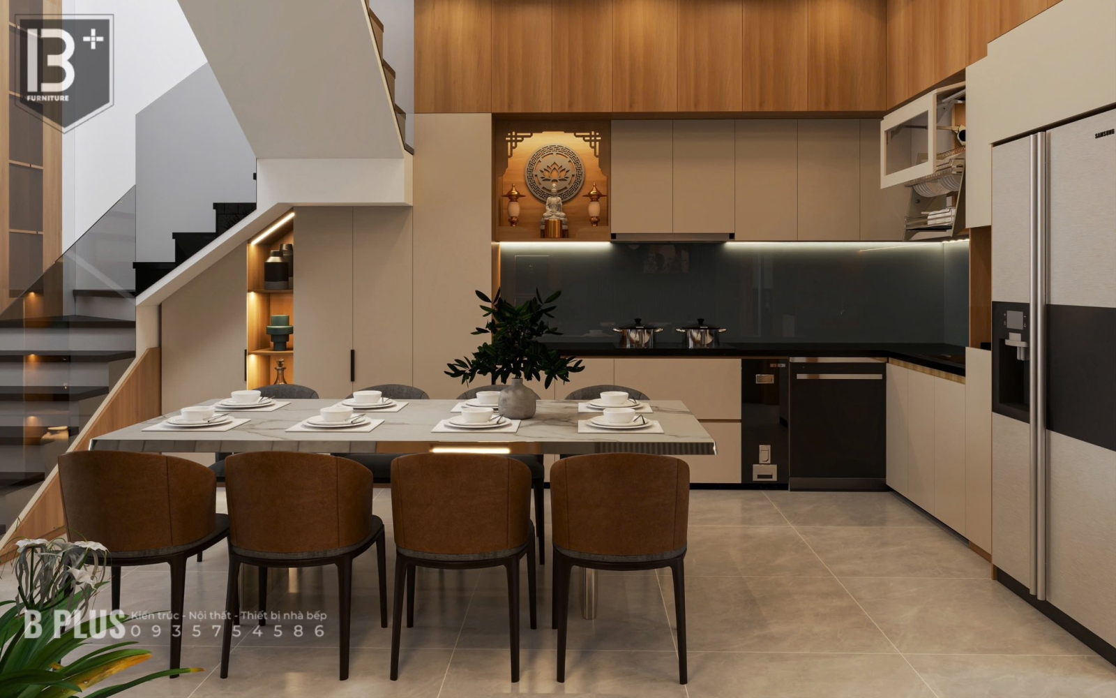 Phòng bếp & ăn: Trái tim của ngôi nhà với hệ tủ bếp kịch trần tối ưu lưu trữ, bộ bàn ăn mặt đá rộng rãi – nơi giữ lửa cho những bữa cơm gia đình.