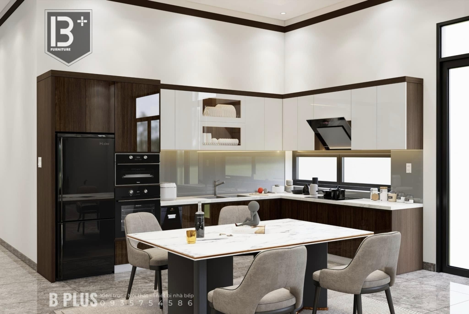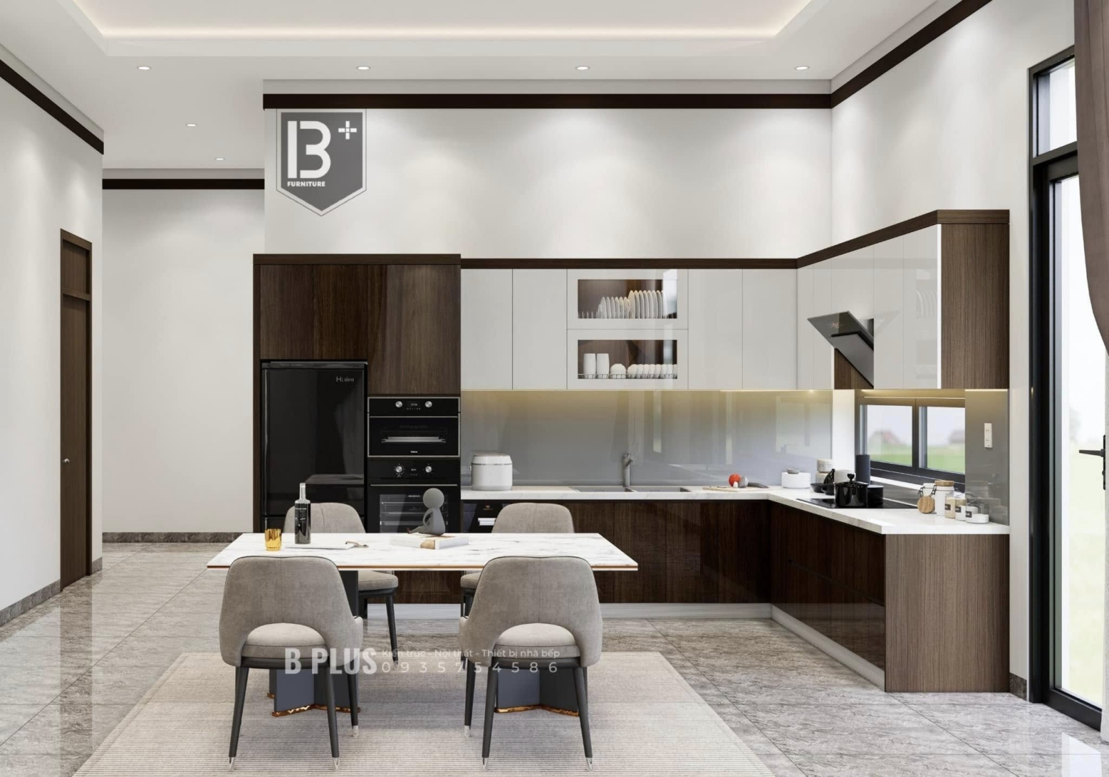 Không chỉ dừng lại ở thẩm mỹ, đội ngũ thiết kế B+ Plus còn chú trọng yếu tố ánh sáng, thông gió và phong thủy – giúp căn bếp luôn thoáng mát, đón năng lượng tích cực và tạo cảm hứng nấu ăn mỗi ngày.