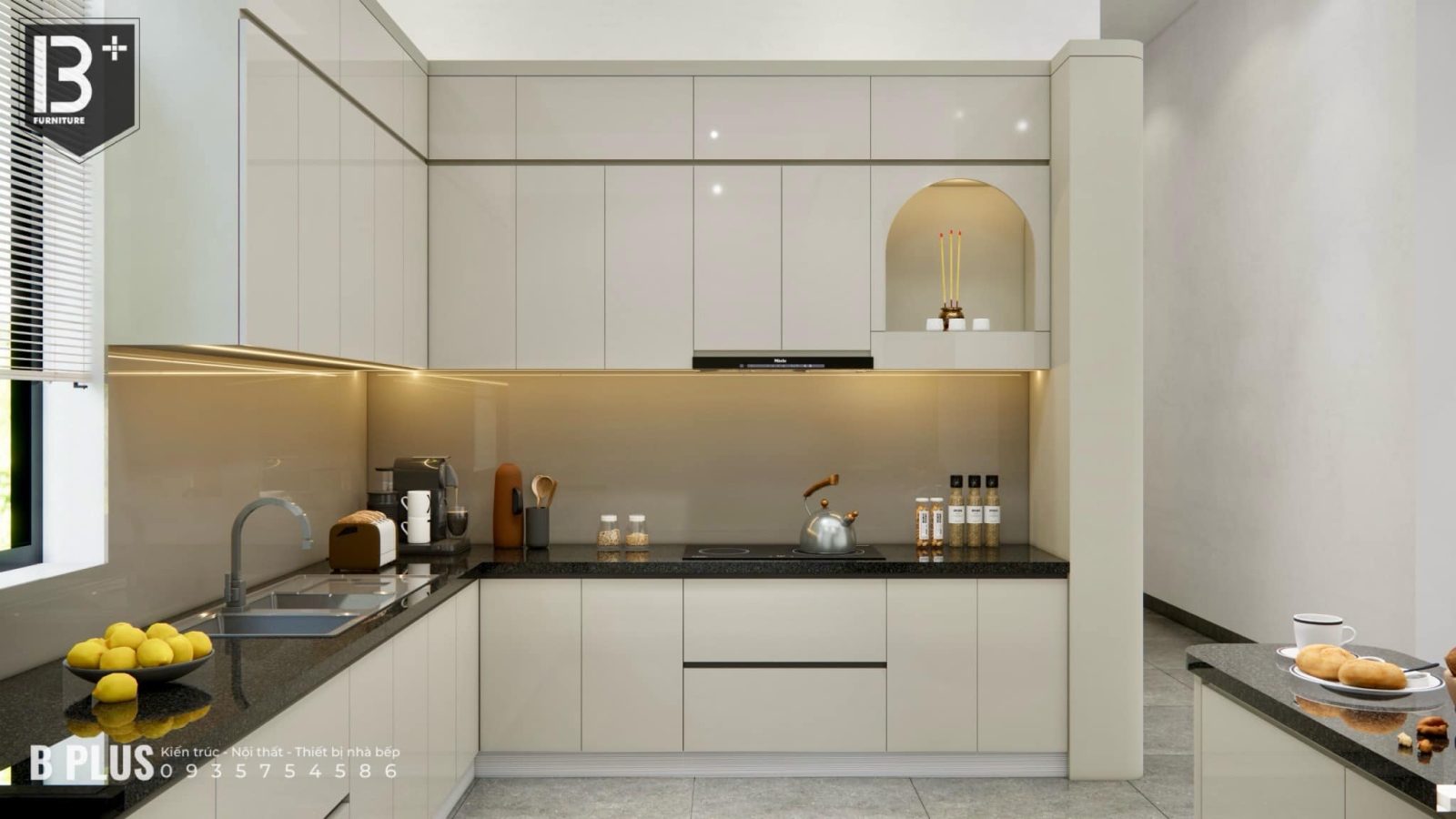 Tại B+ Plus, mỗi mẫu nội thất bếp chữ L được thiết kế dựa trên nguyên tắc “tối đa công năng – tối giản diện tích”. Cách bố trí hai cạnh vuông góc tạo nên không gian nấu nướng gọn gàng, giúp người dùng dễ dàng di chuyển giữa các khu vực rửa – nấu – chuẩn bị – lưu trữ mà không bị vướng víu.